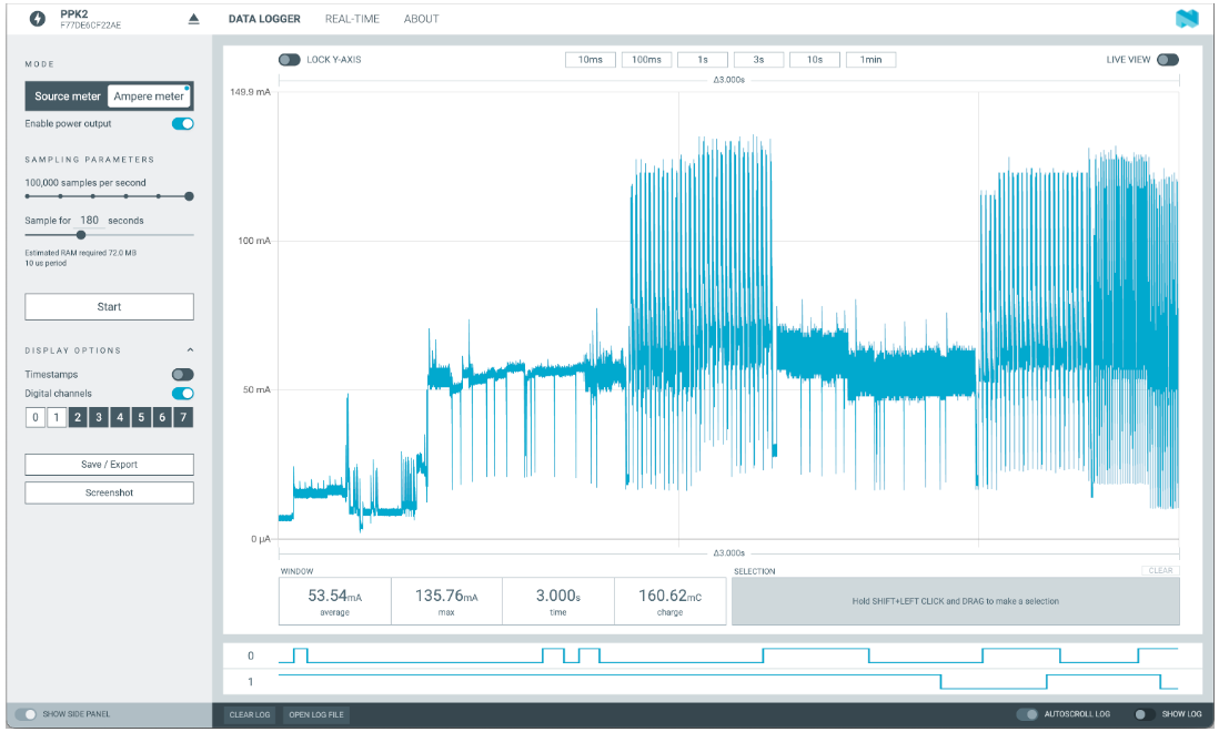 The Power Profiler Kit II (PPK2) is a versatile and affordable tool designed to accurately measure the real-time energy consumption of your electronic designs. It can supply power to an external board or function as an ammeter, measuring currents ranging from a minimum of 500 nA (nanoamperes) to a maximum of 1 A (ampere), offering a detailed and comprehensive view of your application’s specific current profile.